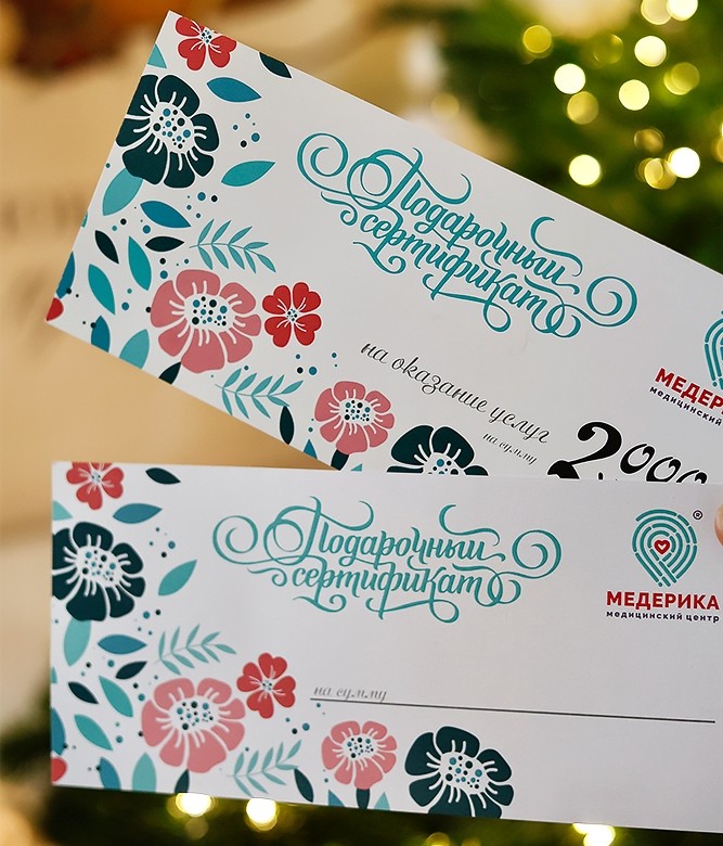 Номинал подарочного сертификата может быть любым — вы можете оформить сертификат на фиксированную сумму либо на конкретную услугу или программу, включая медицинский чек-ап. Приобрести подарочный сертификат можно непосредственно в медицинском центре «Медерика». Все детали обговариваются заранее по телефону с администратором.